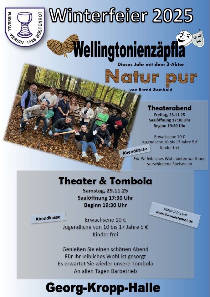 Die Winterfeier des FV Wüstenrot findet dieses Jahr wie gewohnt am Freitag, den 28.11.25 zum Theaterabend ab 17.30 Uhr…